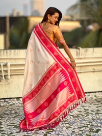 - Pallu: Rich silver zari woven Temple pallu for added sophistication.