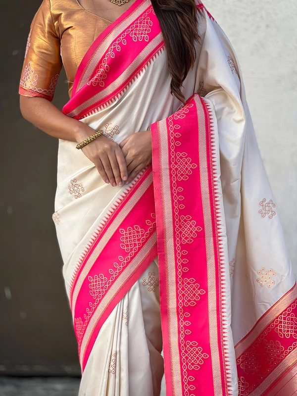 - Border: Unique golden zari rangoli woven border for a regal touch.