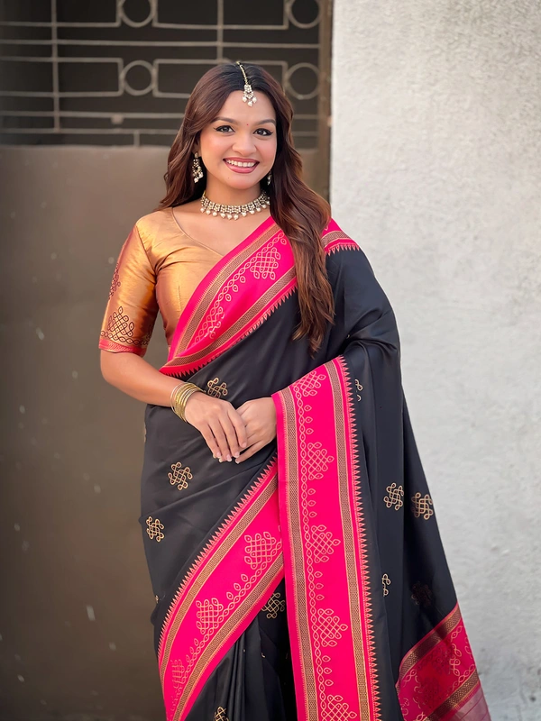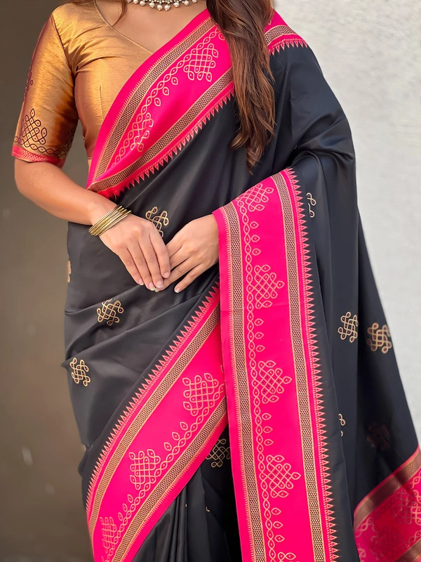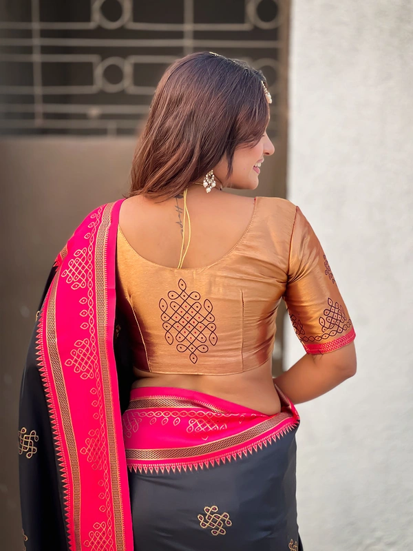 - Exquisite Rangoli Art Zari Motifs: Beautifully woven motifs that adorn the saree, creating a striking visual appeal.
