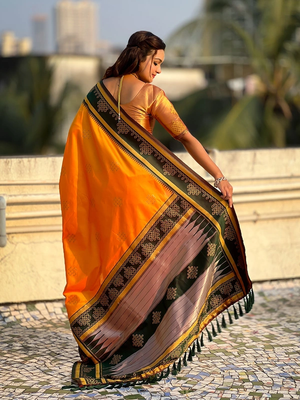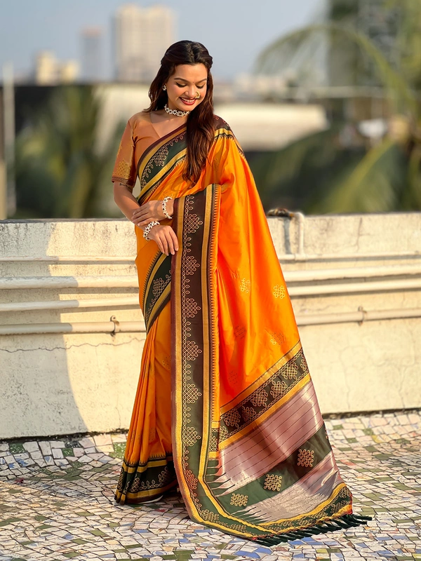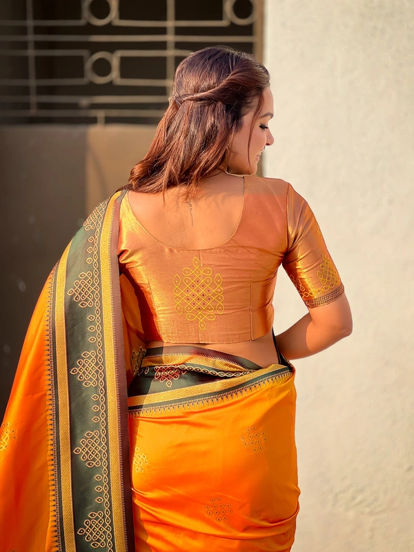 - Border: Unique rangoli-inspired golden zari woven border to enhance the saree’s regal appeal.