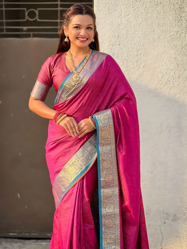- Rich Zari-Woven Pallu: The running pallu is intricately crafted to complement the saree’s grandeur.