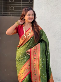 CATALOG : BANDHANI PAITHANI Soft Silk sarees with bandhani zari woven motifs all over the body having Rich woven Paithani meenakari pallu and unique paithani contrast border paired with plain contrast blouse same as shown in videos SET OF 10 COLORS