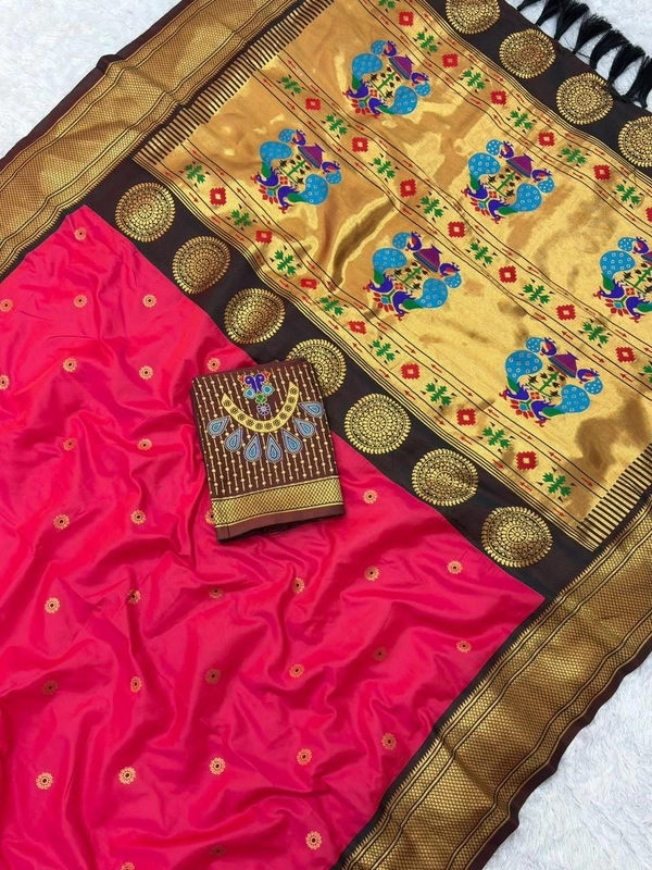 Crafted from premium soft silk, this saree is designed to drape gracefully and bring out your innate charm. The body is adorned with intricate flower meenakari motifs, while the highlight is the striking contrast rich woven Paithani Pallu, featuring exquisite peacock designs that symbolize grace and beauty. Complemented by a traditional contrast border, this saree is a true testament to the timeless Paithani weaving technique.