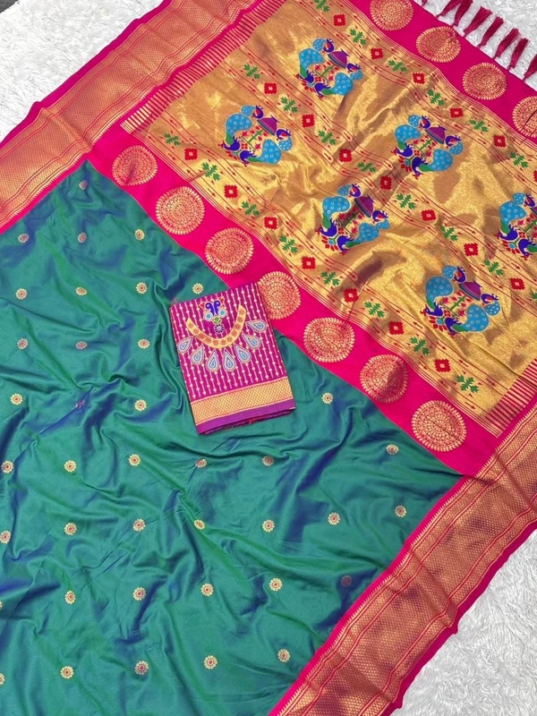- Rich Zari Peacock Pallu: The contrast woven traditional Paithani pallu features a stunning zari peacock design, epitomizing grace and grandeur.