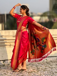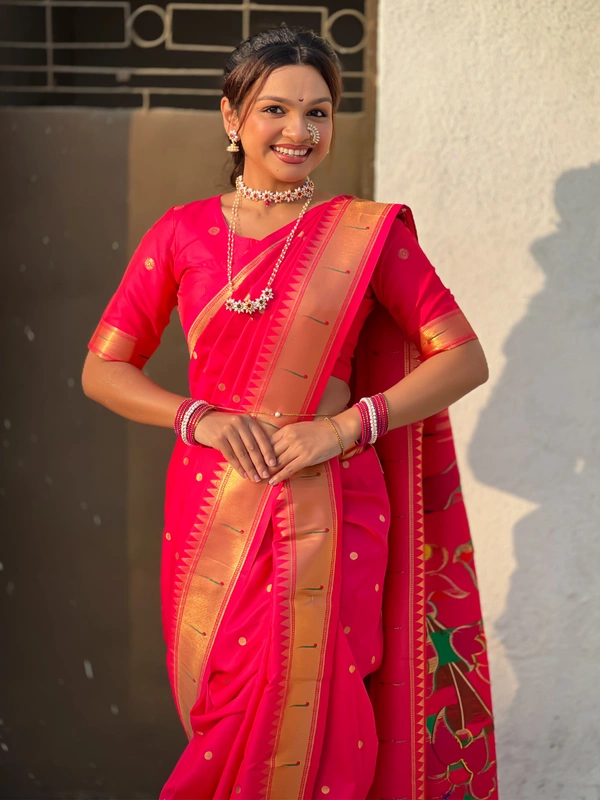 - Border: Embellished with the iconic muniya border, a signature of classic Paithani sarees.