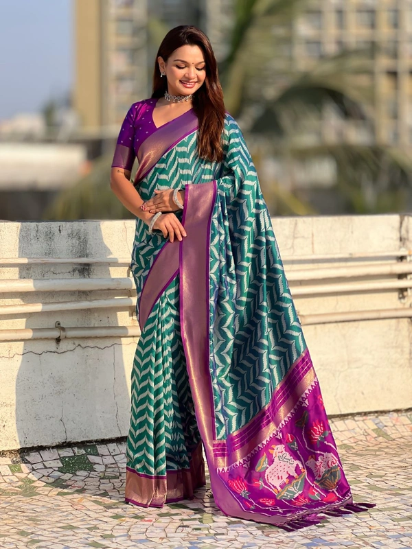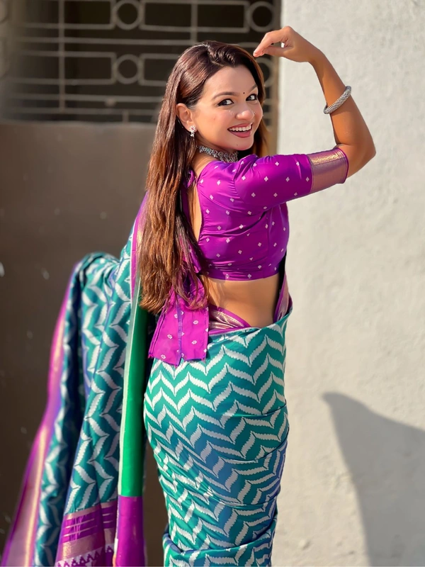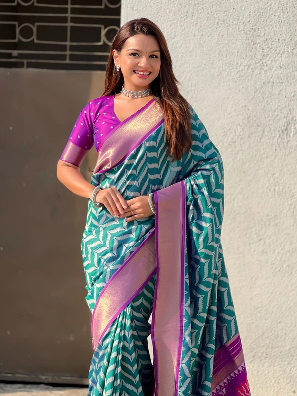Premium Soft Silk Saree with ikkat weaves all over the body having contrast rich woven Pure Pichwai Pallu, simple border and paired with Contrast brocade Blouse same as shown.
