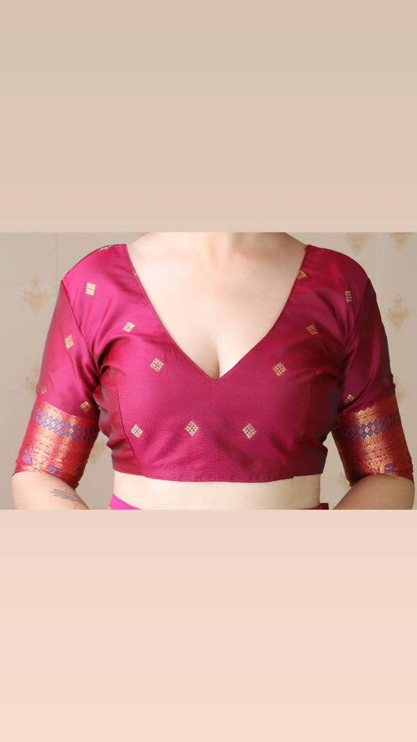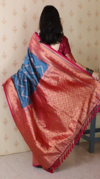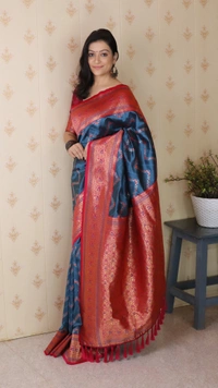 PREMIUM BANARASI SILK CONTRAST COLLECTIONS?? CATALOG : MAITHALI 10 COLORS Premium Banarasi Soft Silk Sarees with gold zari zigzag geometric weaves all over the body, having rich zari woven contrast pallu and paired with brocade contrast Blouse Fabric : Banarasi Silk Technique for Work : Zari Woven Style : Festive Wear Length : 5.5 Meter 0.80 Meter Blouse same as shown (Unstitched) Width : 44 inch (approximate) RATE : 1100/-