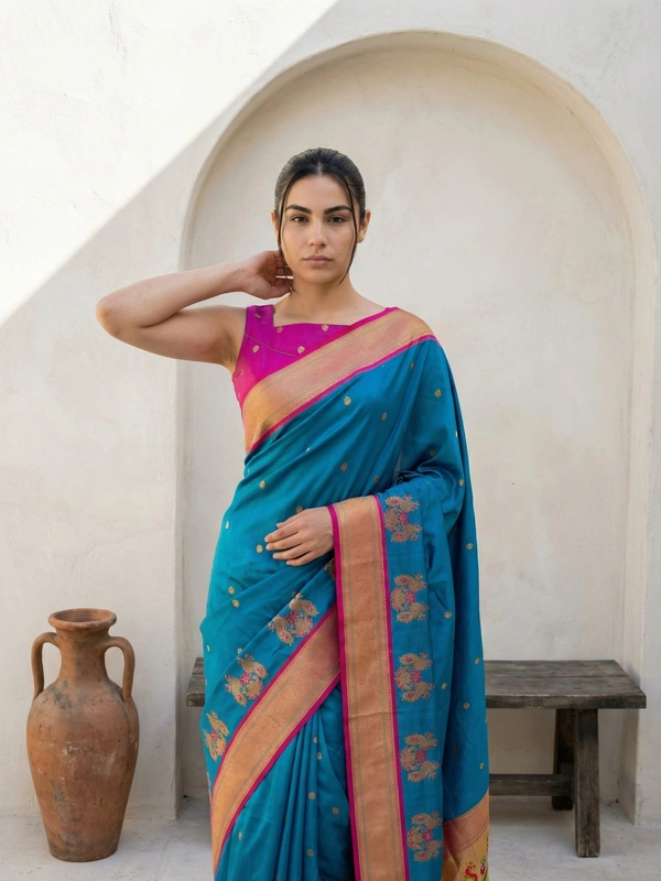 Soft Silk Paithani Saree with polka motifs all over the body having contrast rich woven traditional original Paithani Pallu, contrast traditional peacock panel border and paired with Blouse same as shown.
