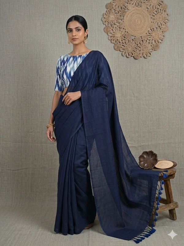 Pure Khadi Cotton Saree with Unstitched Blouse Piece - Navy Blue Elegance