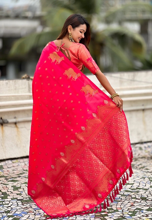 *SUPER HIT MOONGA SILK SAREES* CATALOG : NANDI Soft Moonga Silk sarees with zari motifs all over the body having Rich woven dual zari pallu and unique beautiful dual zari Nandi border paired with brocade butti running blouse same as shown in video SET OF 7!!!
