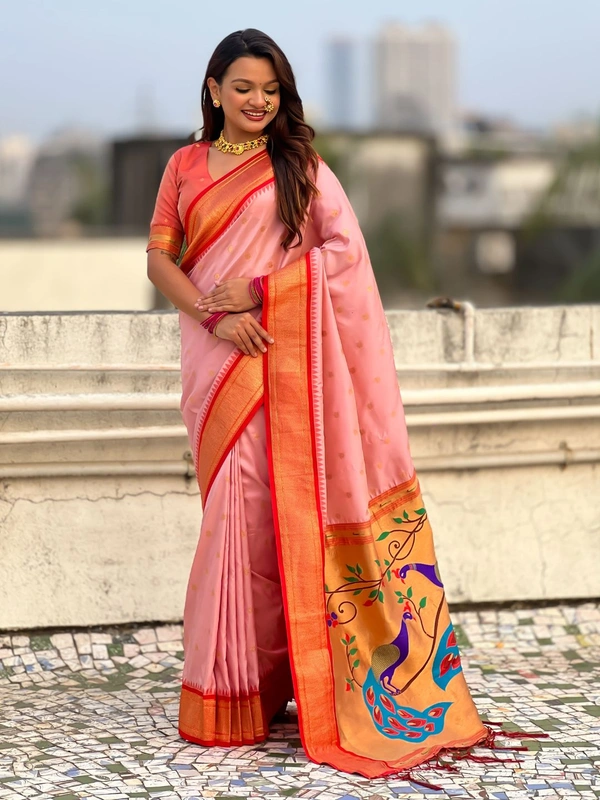 Paithani Saree with zari woven motifs all over the body having contrast rich woven rich meenakari Peacock Paithani Pallu, crafted with red gadwal zari woven border and paired with contrast Brocade Blouse same as shown.